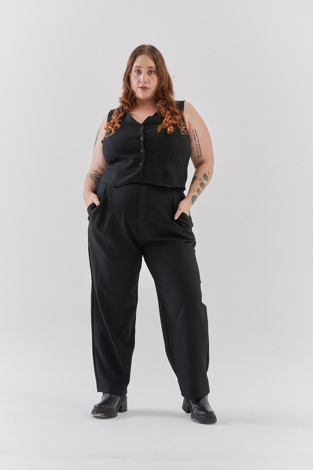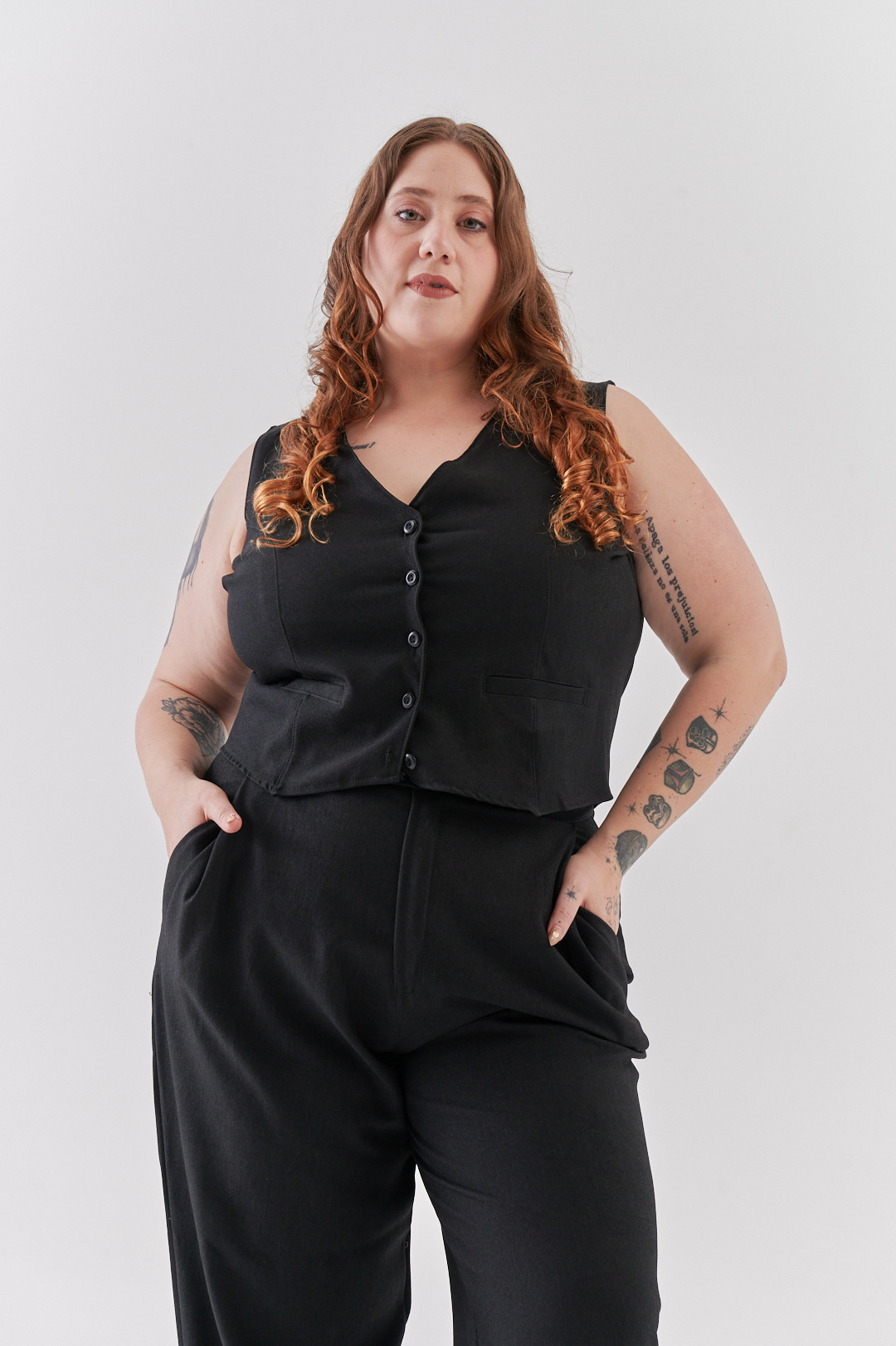 Chaleco corto con botones en el delantero y ajuste en la espalda, detalle de bolsillo de vista en delantero.