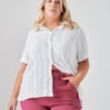 La remera TANI de Entro Talles Grandes está confeccionada en jersey y trabaja con frunces estratégicamente ubicados en las sisas y el lateral. Este recurso de moldería no es decorativo: en cuerpos con busto grande, el frunce en la sisa distribuye la tela sin tensar la prenda, evitando que la costura “suba” hacia la axila. El frunce lateral, a su vez, genera movimiento visual sobre la zona de la cintura-cadera sin ajustar. Un diseño que parece sencillo pero incorpora soluciones técnicas reales para el talle grande.