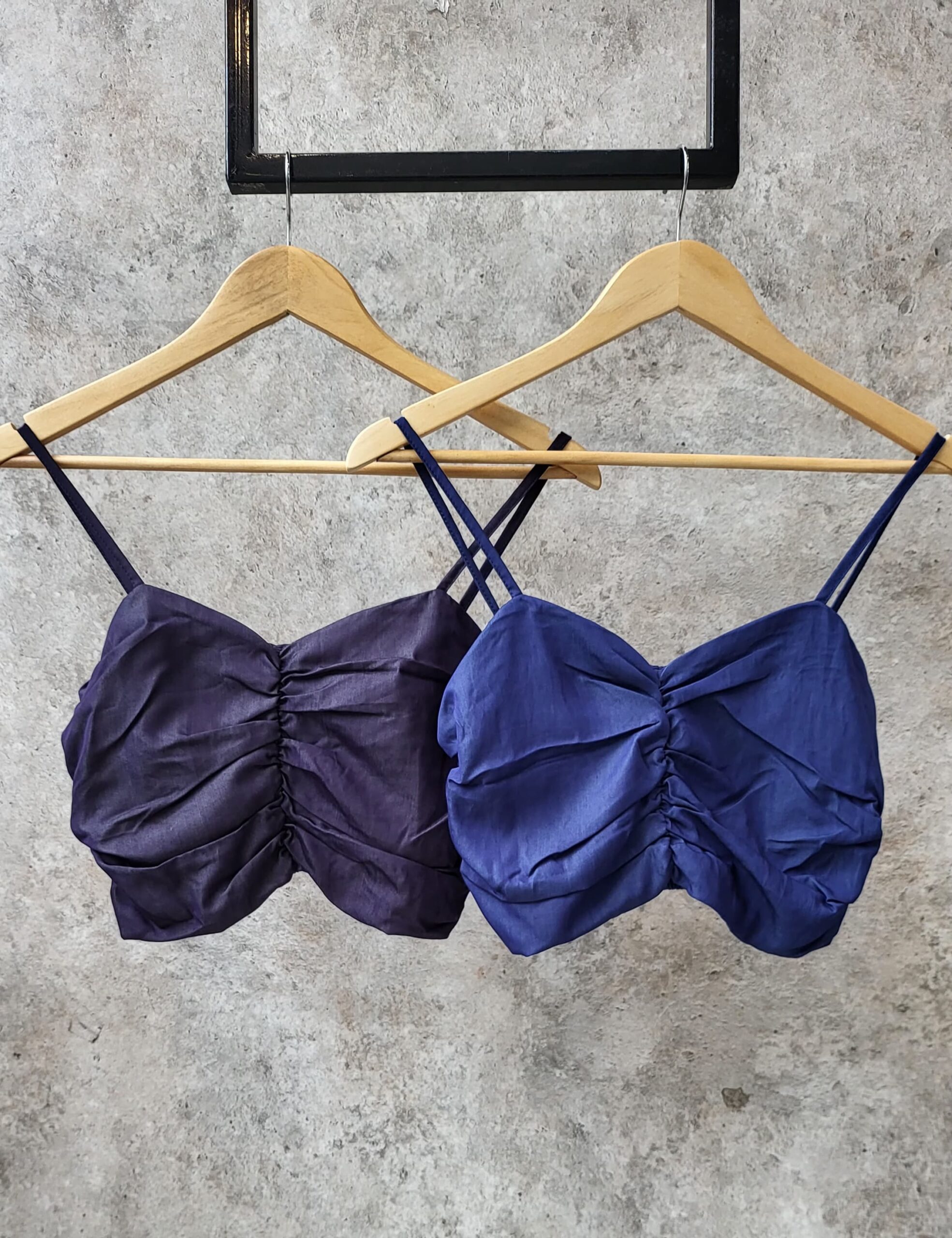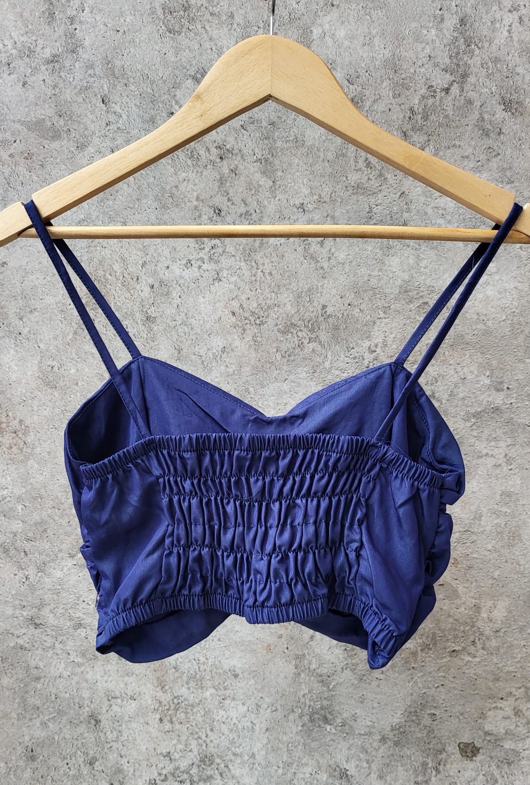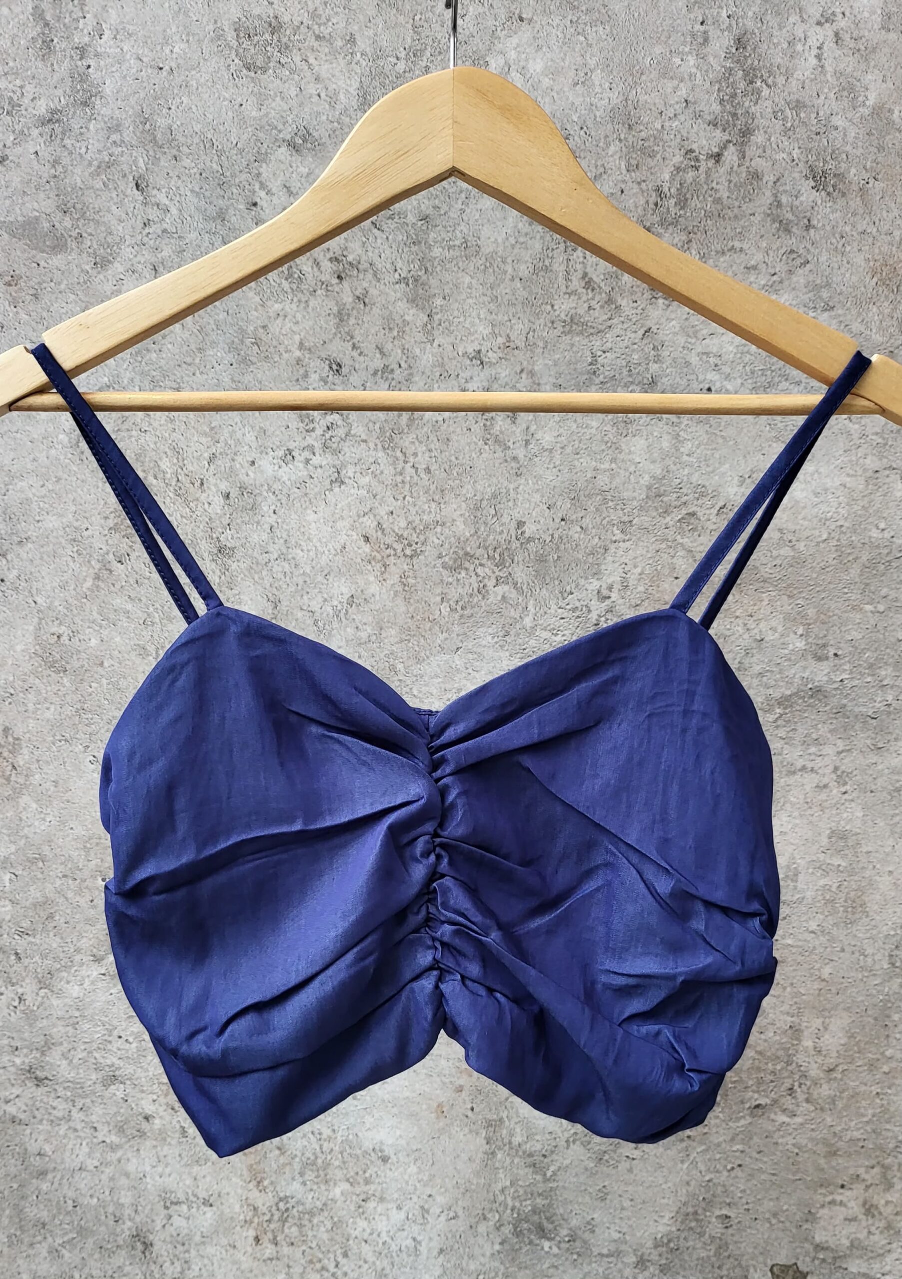 top simil jean con frunce en espalda y bretel